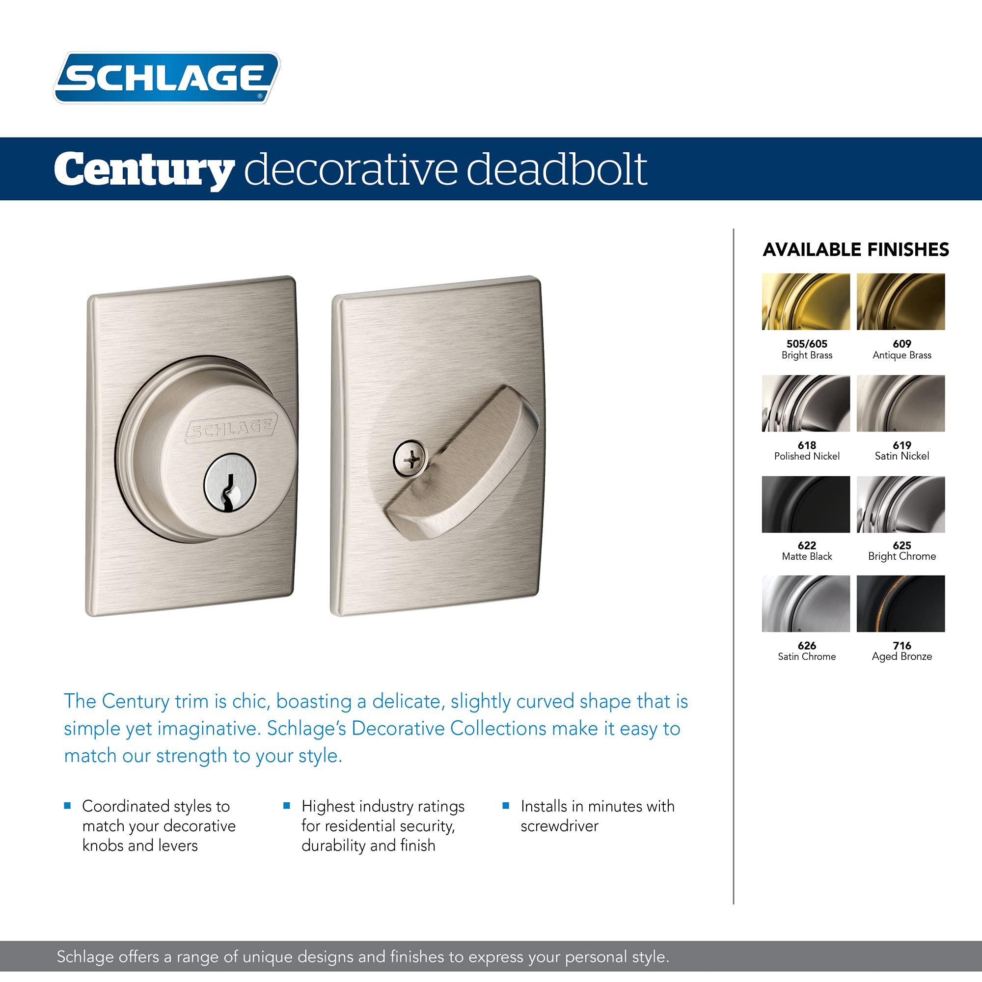 Schlage B60 N CEN 619 Deadbolt with Century Trim, Keyed 1 Side, Highest Residential Security, Satin Nickel