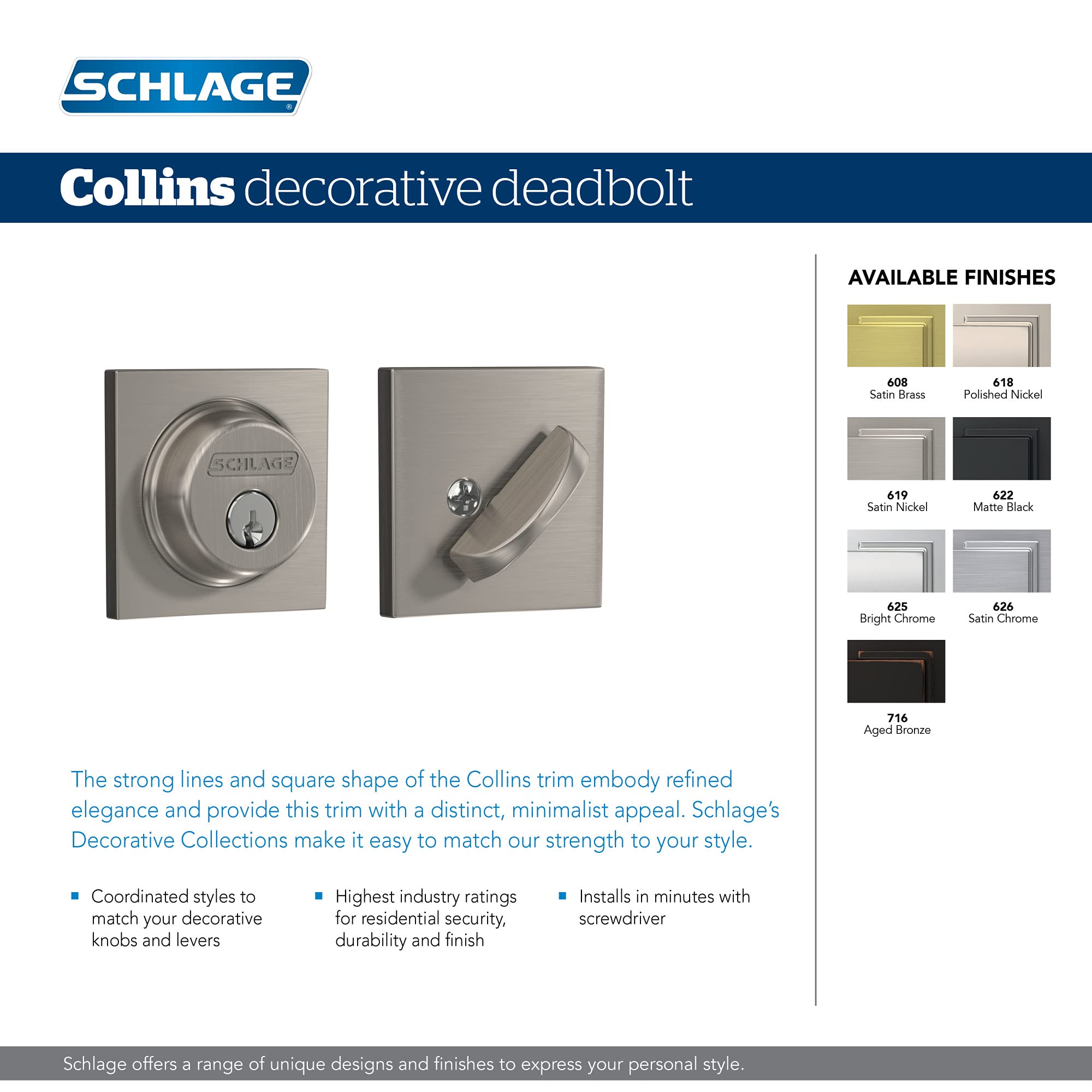 Schlage B60 N COL 622 Deadbolt with Collins Trim, Keyed 1 Side, Highest Residential Security, Matte Black, B60NCOL622