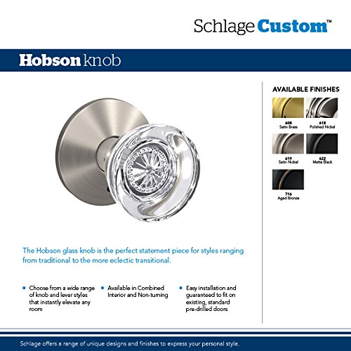 Schlage Custom FC21 HOB 619 KIN Hobson Glass Knob with Kinsler Trim Hall-Closet and Bed-Bath Lock, Satin Nickel